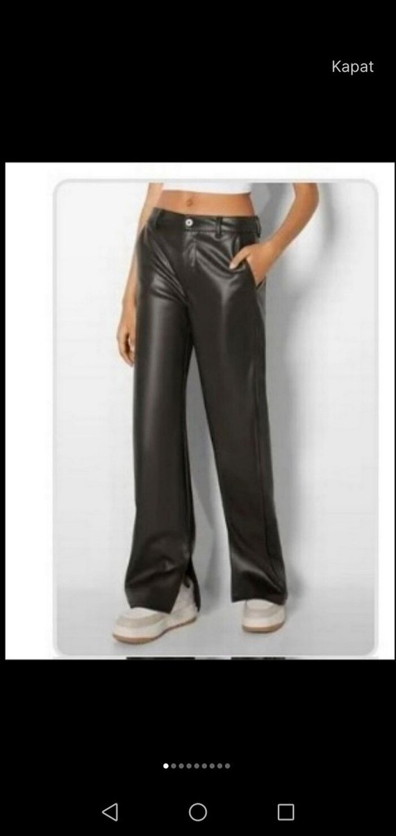 Deri siyah, regular fit ve kemerli düz paça pantolon, parlak görünümlü, günlük rahat kullanıma uygun.