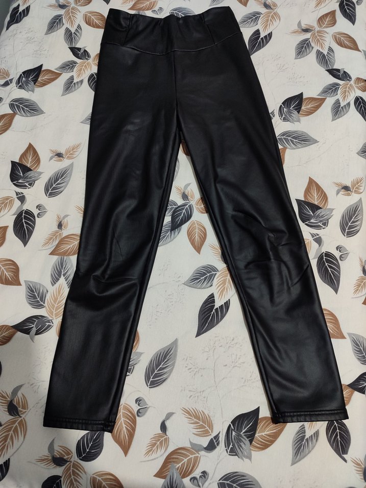 Siyah deri , beli lastikli ve normal midi boyda, trend sokak stili için uygun dar kesim kadın tayt. içi polardir