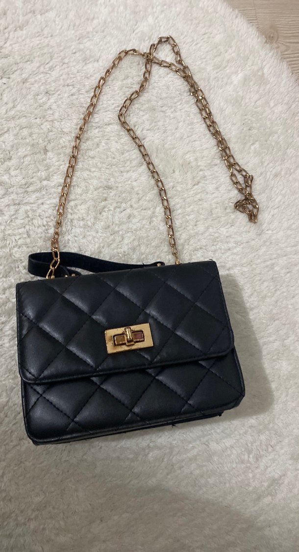Kapitone desenli siyah deri kadın çanta, tokalı kapama ve altın zincir askıyla Paris tarzı klasik şıklığı ve sokak modasını bir araya getirir.
