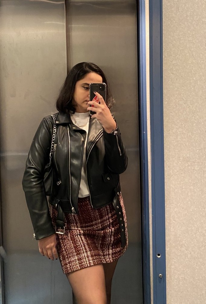 Deri siyah kemerli, uzun kollu, yaka detaylı ve dar kesim kadın ceket, sokak stiline uygundur ve ekose desenli etekle kombinlenmiştir.