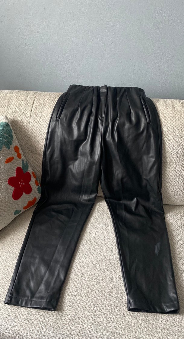 Siyah deri, kemerli ve rahat kesim kadın pantolonudur. Midi boyda olup günlük kullanıma uygundur.