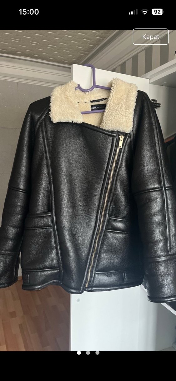 Kürklü detaylı, siyah deri biker ceket. Notlu yaka ve asimetrik fermuar kapamalı, normal boy ve dar kesim.