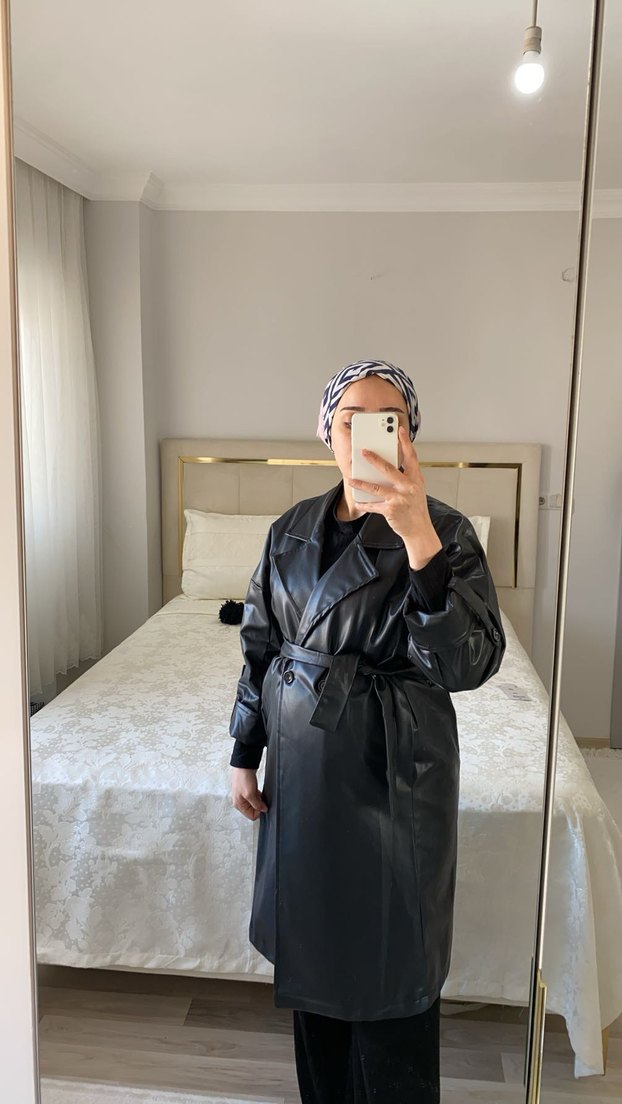 Deri Siyah Kuşaklı Uzun Trençkot