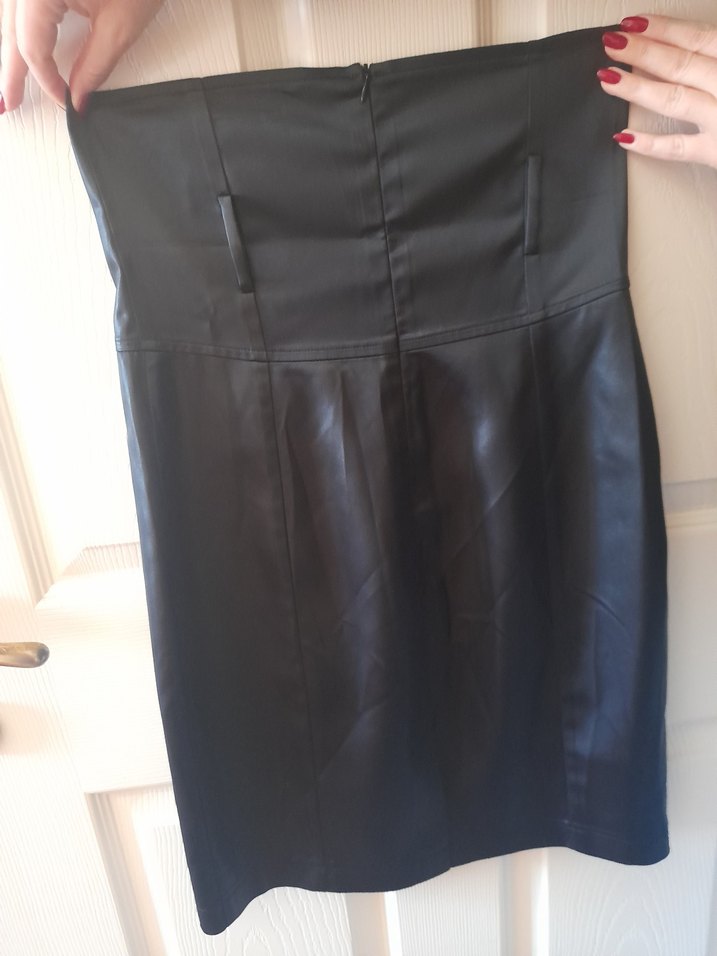 Siyah deri, pile detaylı, vücuda oturan midi hamile eteği. Gotik stile uygun, romantik akşamlar için ideal.