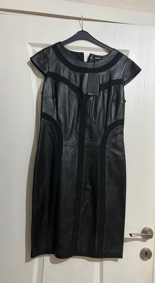 Deri, siyah midi elbise, kolsuz ve yuvarlak yakalı, tarzda ofis kullanımına uygun.