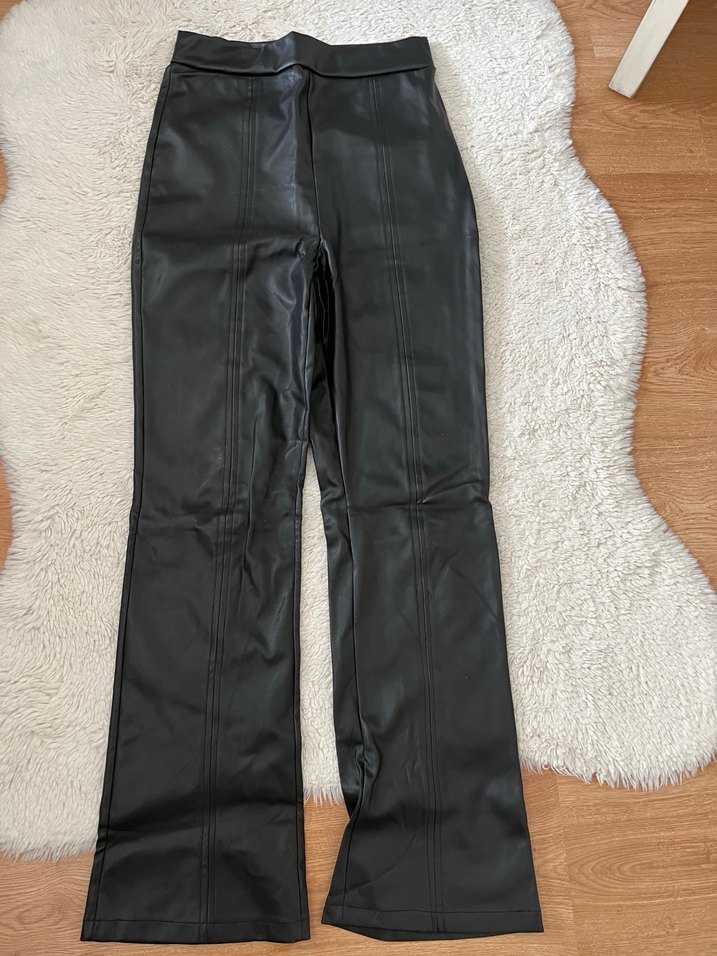Siyah deri, kemerli ve midi boy, dar kesim kadın pantolon. Minimalist ve desensiz, günlük sokak stili için uygundur.