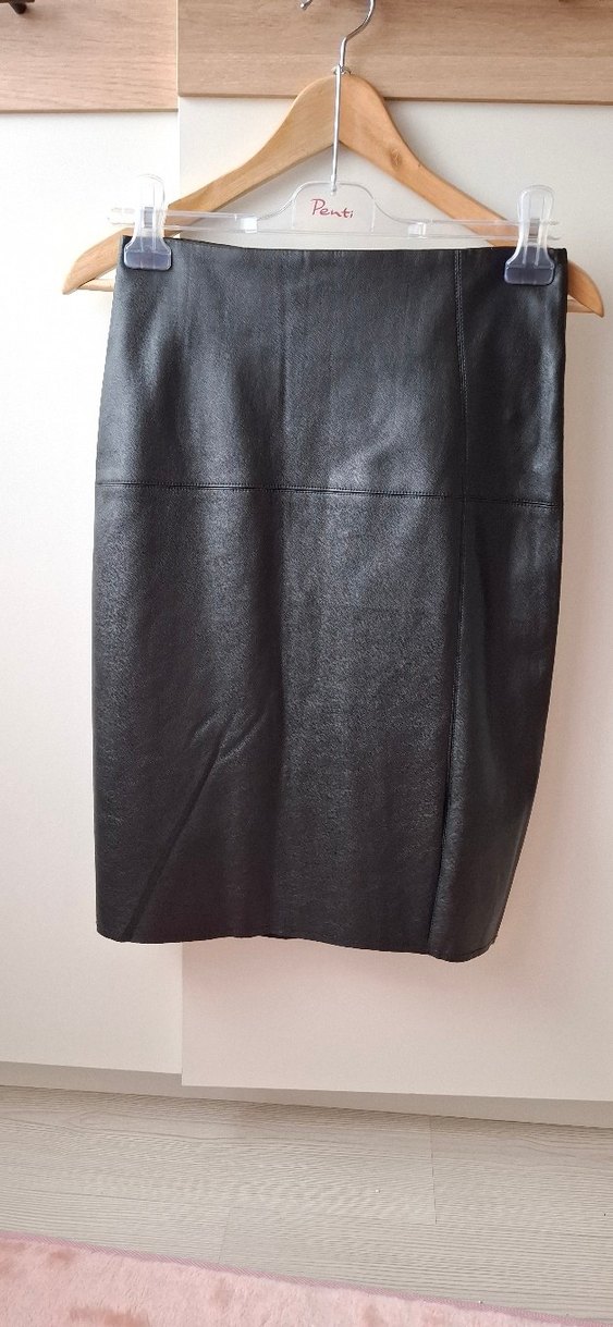 Dar kesim,mini yırtmaçlı, siyah deri midi kalem etek. Minimalist tarzıyla ofis için uygun. Ürün Urladaki bir mağazadan alınmıştır. El yapımıdır. Sıfırdır.