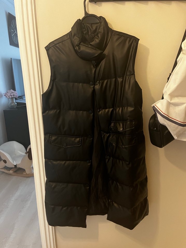 Kolsuz siyah deri yelek, yüksek yakalı Midi boyu ve minimalist stili günlük kullanım için uygundur. Boyu tesettür için de uygundur maksimum 4 kere giyildi. Cepleri yandadır. Öndekiler cep değil