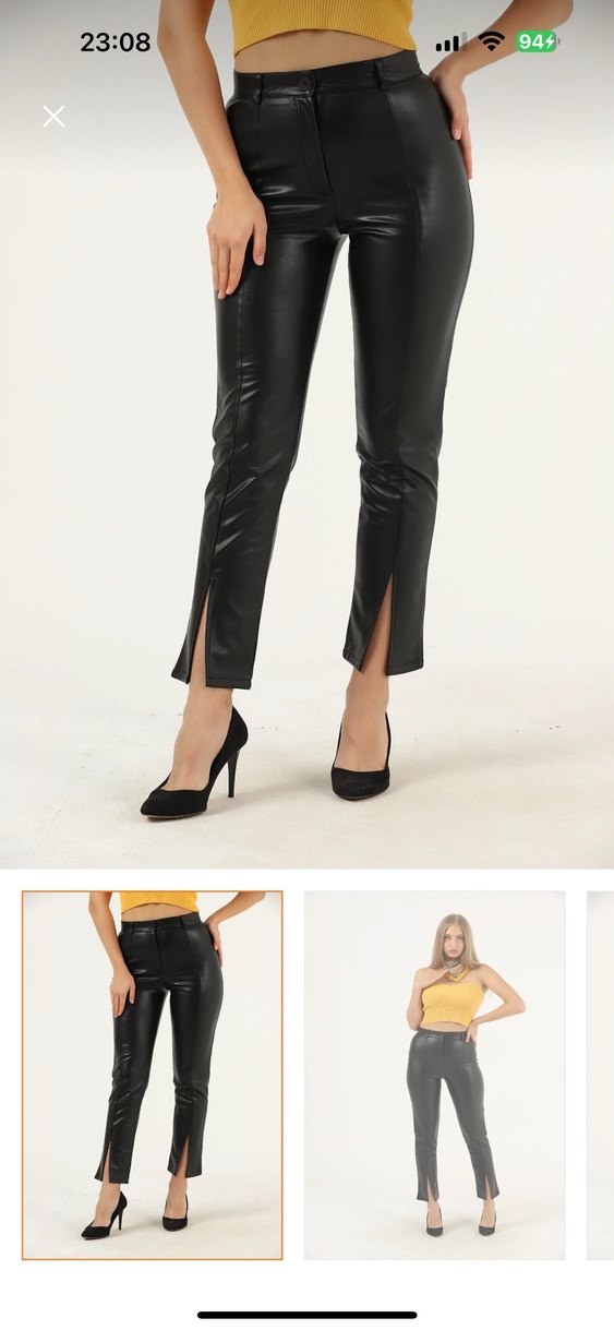 Siyah deri, regular fit ve midi boy sigara paça pantolon. Ön kısmında yırtmaçlar bulunur, şık sokak stili için uygundur. Günlük iş kombinlerine uygun.