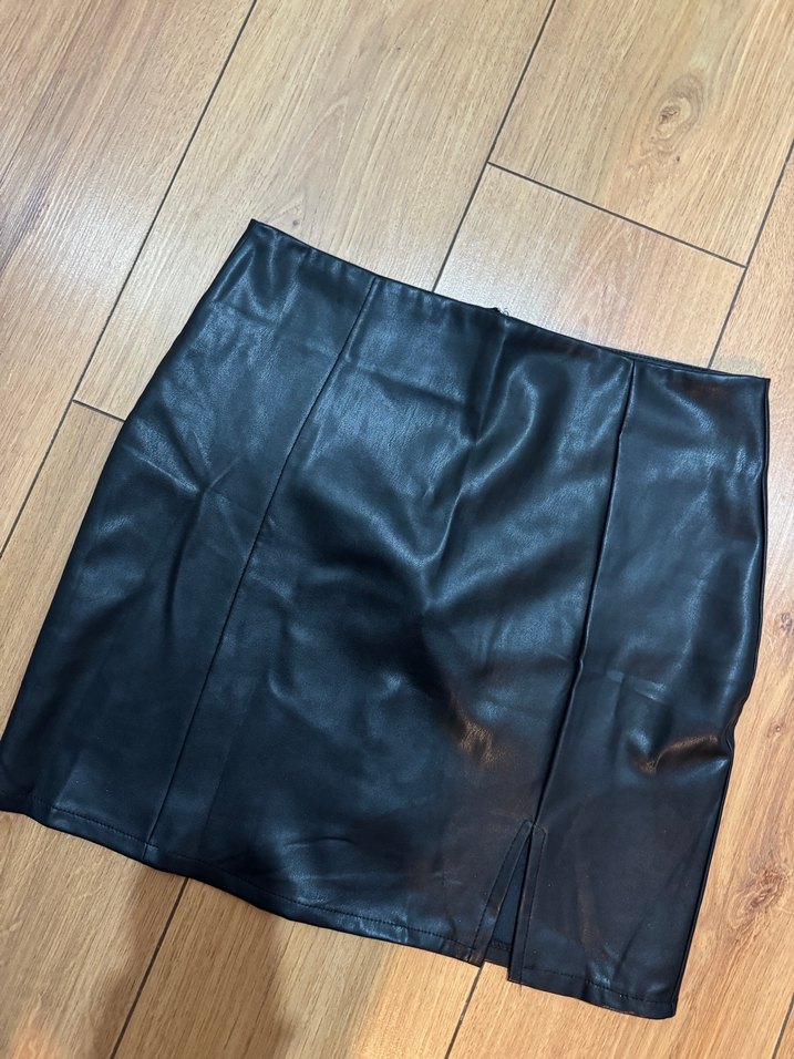 Deri siyah mini etek, sade ve desen içermeyen yapısıyla küçük yırtmaç detayı taşır. Cesur tarzlar için uygundur. İçi sıcak astar