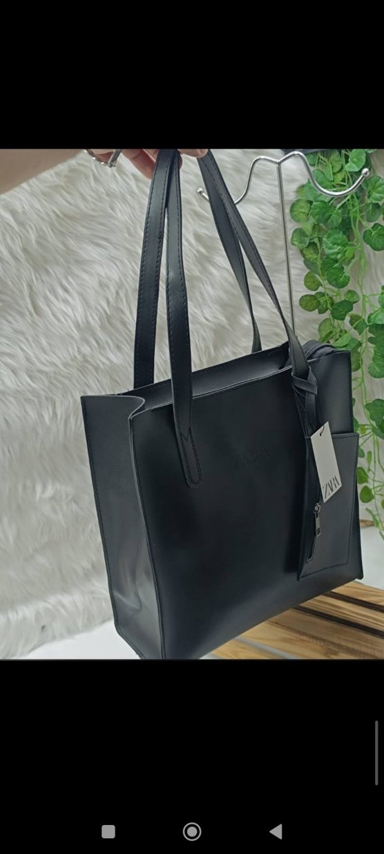 Siyah deri kadın çanta, minimalist ve düz tasarıma sahip. Fermuarlı kapama ve uzun sapları ile günlük kullanım için uygundur.