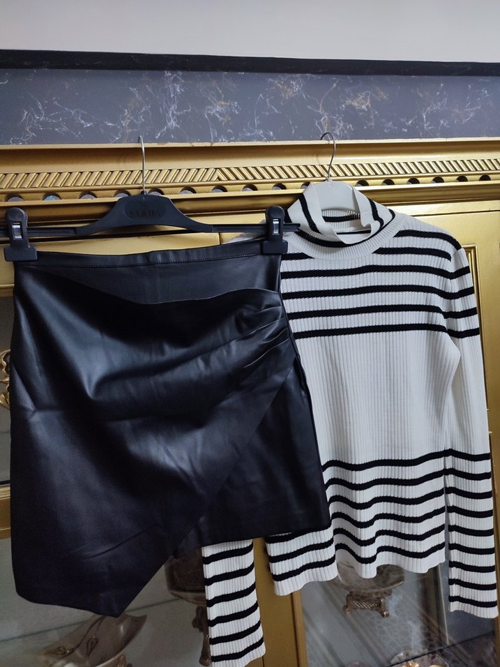 Dar kesim, siyah deri mini şort, pilili ve çizgili desene sahip. Paris tarzı sokak modası için uygun, günlük kullanıma ideal. Karol marka muhteşem takım