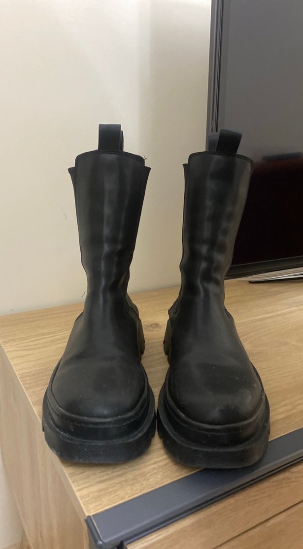 Siyah deri platform topuklu, tokalı gotik tarzda kadın botları. Günlük kullanıma uygun, cesur ve şık görünümlü.