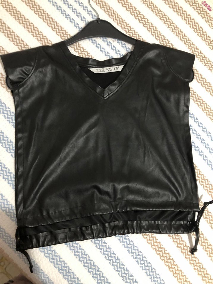 Siyah deri, V yakalı, kısa kollu ve bol kesim mini bluz. Sokak stiline uygun kemer detayı bulunur. Günlük kullanıma uygundur.