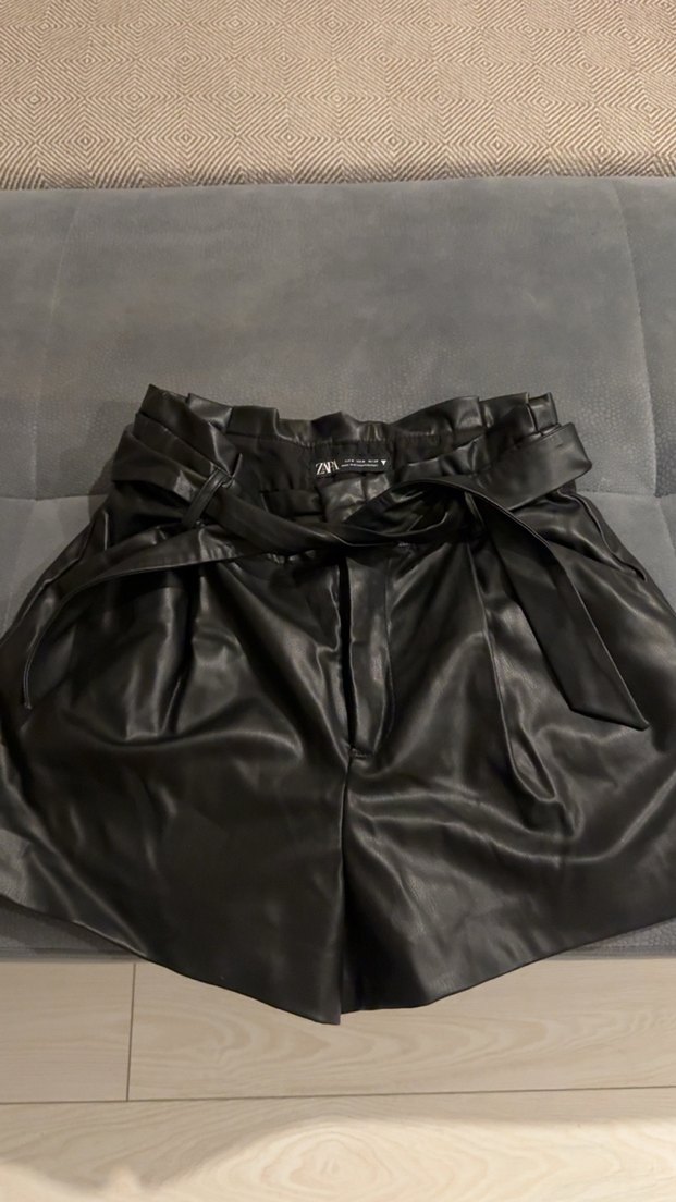 Siyah deri, kemerli ve bol kesim mini şort. Düz ve desen içermeyen tasarımıyla günlük kullanıma uygundur, gotik tarzda.