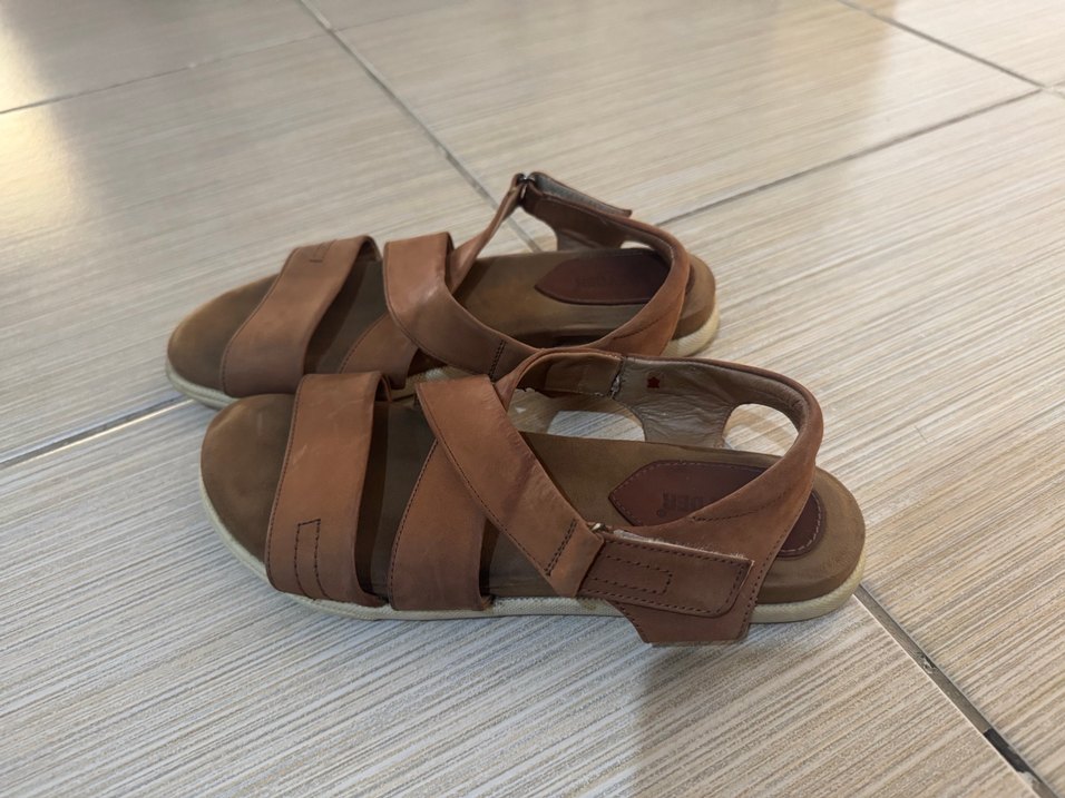 Taba deri kadın sandaletler, dolgu topuklu ve tokalıdır. Minimalist tasarım, rahat ve günlük kullanım için uygundur, bohem tarzıyla tamamlanır.