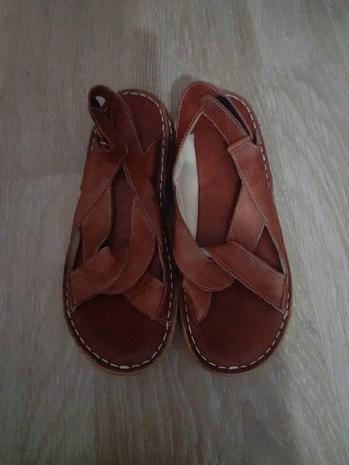 Deri malzemeden yapılmış, taba renkli, dolgu topuklu ve tokalı kadın sandaletleri. Minimalist ve sade tasarımıyla öne çıkar.