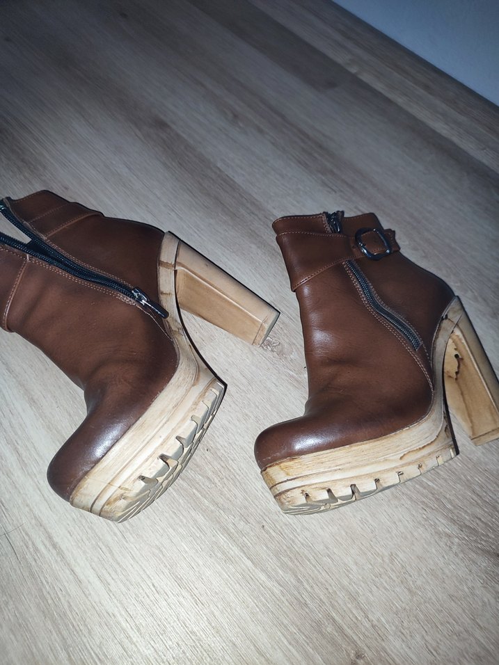 Taba renkli, deri kadın botları platform topuklu ve tokalıdır. Parlak görünümlü olup günlük sokak stiline uygundur.