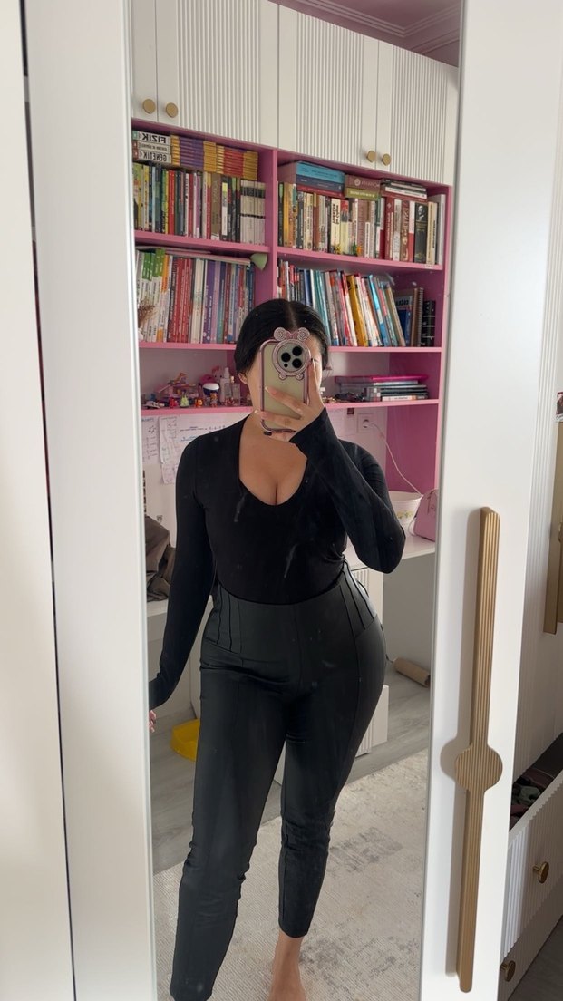 V yaka ve uzun kollu, siyah deri midi elbise. Gotik tarzı ofis şıklığıyla buluşturan, sade ve şık tasarım.