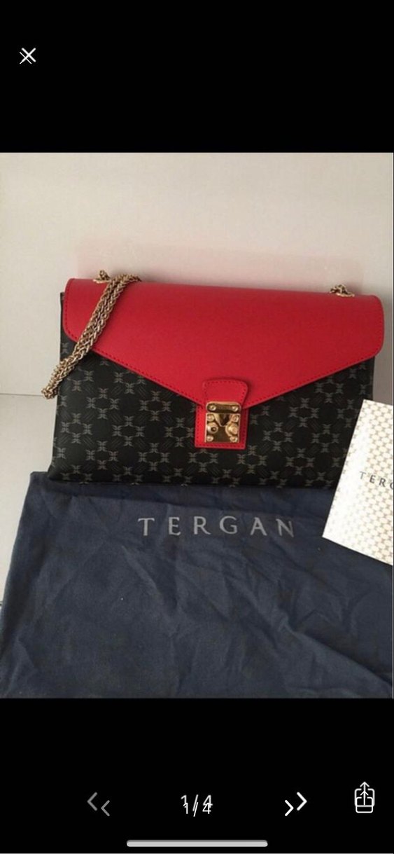 Tergan deri çanta, baskılı deseni, koyu kırmızı kapak ve altın zincir detaylı çanta, yenidir