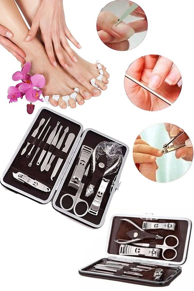 Renkli manikür ve pedikür seti; tırnak makası, makas ve itici gibi çeşitli araçlar içerir, kompakt bir kutuda düzenlidir.