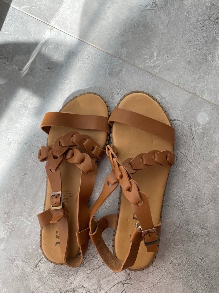 Kahverengi deri sandaletler, ve tokalı kayışlara sahip, örgülü detaylıdır. Minimalist bohem tarz için uygundur.