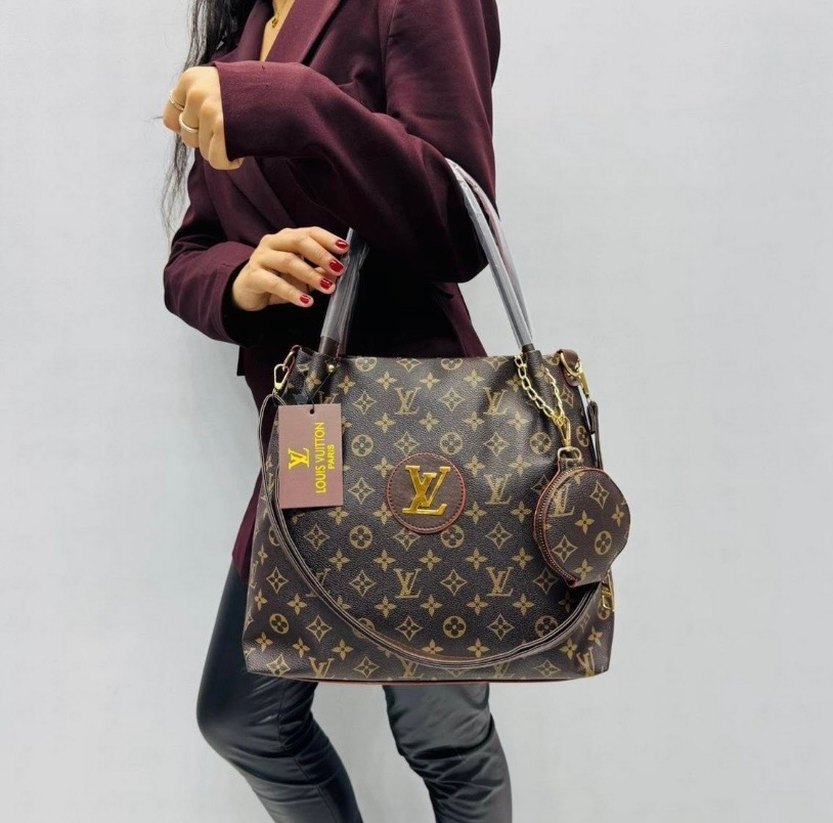 Koyu kahverengi deri omuz çantası, baskılı desen ve tokalı detaylara sahiptir. Günlük sokak stiline uygundur ve küçük bir cüzdan eki içerir.