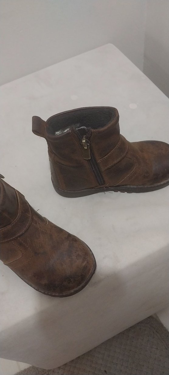 kahverengi deri botlar, tokalı tasarım ve yan fermuar içerir. Vintage counterculture tarzında, desensiz görünüme sahiptir.