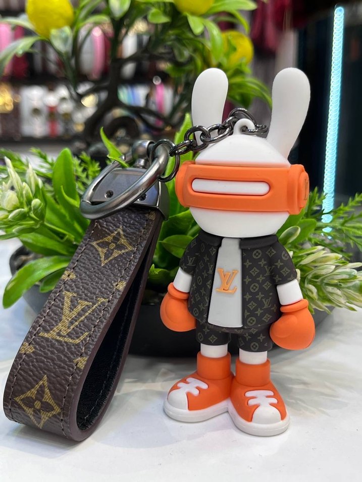 Deri tokalı kayışa sahip, renkli spor ayakkabılı ve eldivenli sokak stili figürlü tavşan anahtarlık. Trendy günlük tarz için uygun.