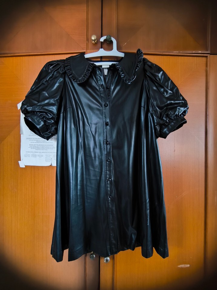 Parlak siyah deri kısa balon kollu, yakalı bluzu. Salaş kesim göğüs ölçüsü 58 cm, boy 85, kalça genişliği 83cm içinde süet kuması var son baharlık kışlık uygundur. Çok az kullanılmış, tertemiz üründür.