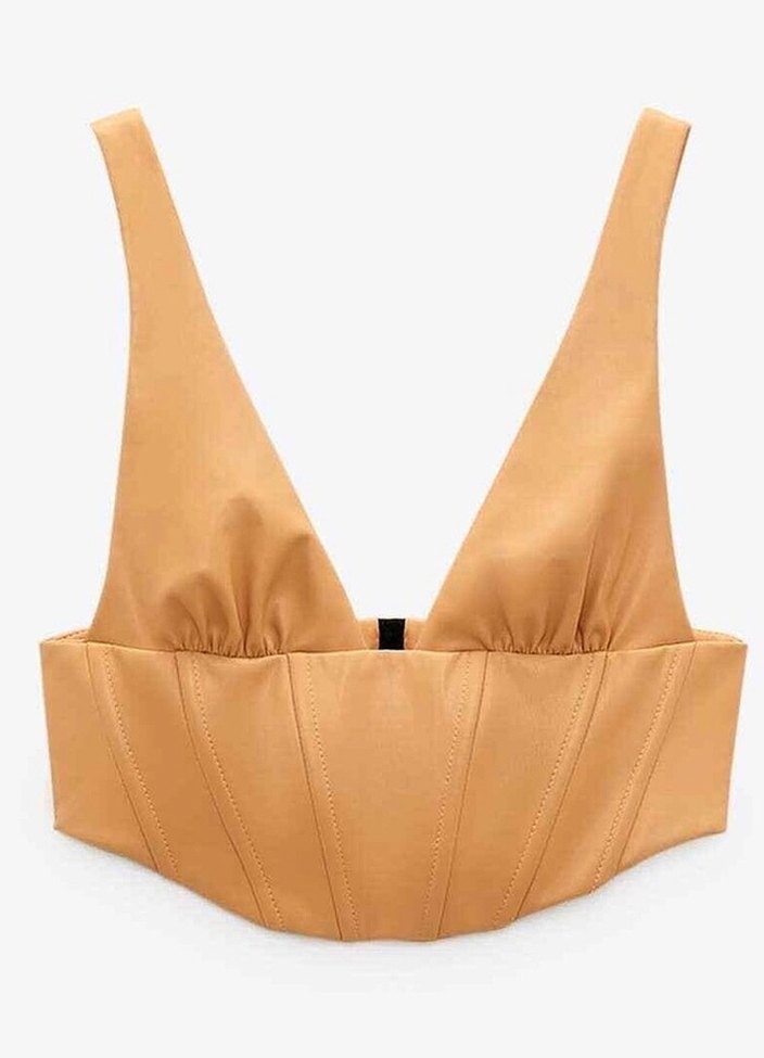 V yakalı, kemerli ve parlak bej deri bustiyer. İnce askılı, vücuda oturan kesimiyle sokak modasına uygun günlük kullanım için ideal.✨