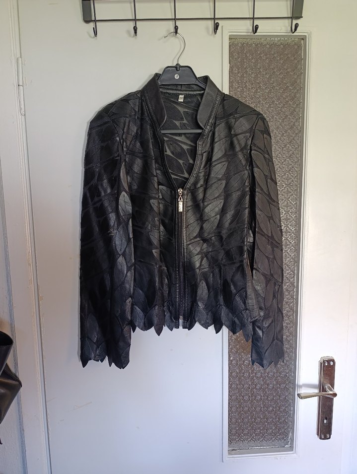Siyah tül üstüne deri yaprak desenli, kısa ceket. Notlu yaka, uzun kollu ve standart kesim ile günlük kullanıma ve davetlere uygun,şık bir ceket