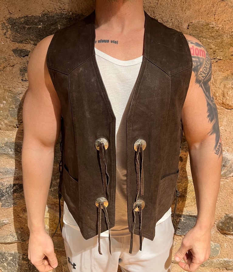 Western Süet Biker Yelek – Amerikan Heritage Klasik Western (kovboy) estetiğini biker kültürüyle buluşturan ikonik bir parça. Koyu kahverengi hakiki süet deri yapısı, yıldız motifli gümüş renkli concho detayları ve ayarlanabilir yan bağcıklarıyla güçlü bir karakter sunar. “Western Yoke” V dikiş kesimiyle tamamlanır. Ölçüler: • Ense – etek: 56 cm • Koltuk altı – koltuk altı: 57 cm Diğer ilanlarımıza da bakabilirsiniz. Kargolama aynı gün özenle yapılır. #westernstyle #bikeryelek #suetderi #heritagestyle #vintageleather #thevintagegarage
