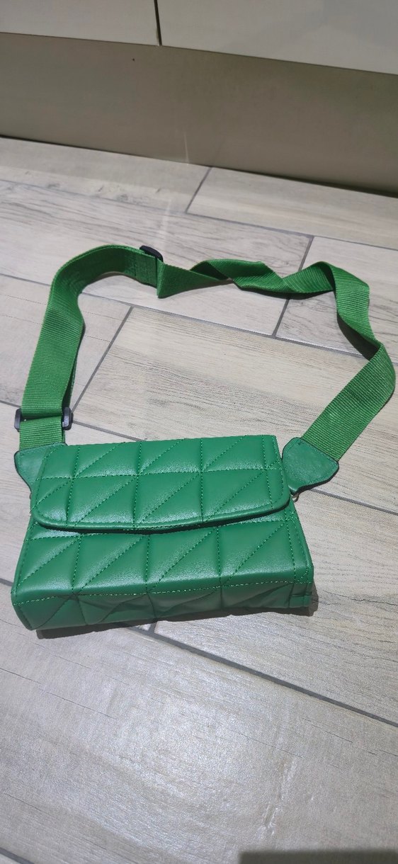 Yeşil deri, kapitone desenli ve ayarlanabilir kemer askılı kol çantasıdır. 1 kez kullanildi