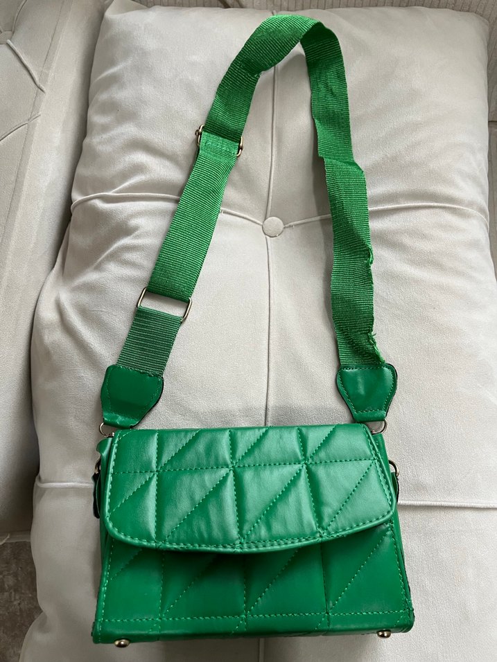 Yeşil deri, kemerli askılı kadın çantası. Minimalist ve desensiz tasarımıyla günlük kullanım için uygun sade bir model.