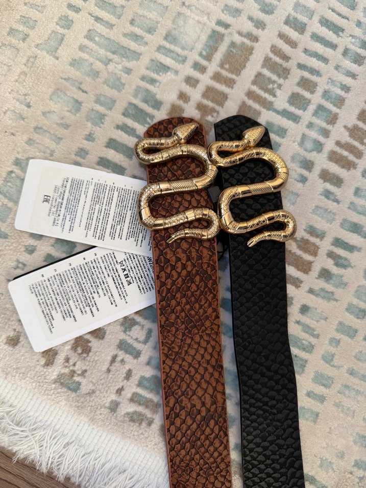 Kahverengi ve siyah deriden, dokulu desenli kadın kemerleri, bohem ve retro tarz için altın yılan şeklinde tokalar içerir.