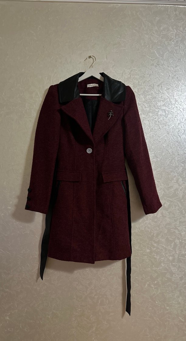 Boyu 96 cm ,Bordo renkte, deri yaka detaylı ve tek düğmeli kaban. Bel kuşağı ve cepleriyle şık ve zarif bir görünüm sunar.