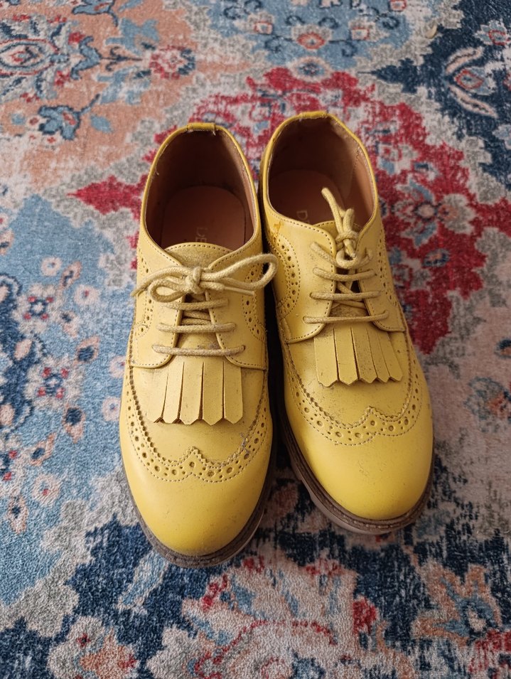 Sarı deri, püsküllü ve blok topuklu kadın klasik ayakkabısı, renkli ve desensiz tasarımıyla günlük kullanıma uygundur. iki defa giyildi. kutusu mevcut değil