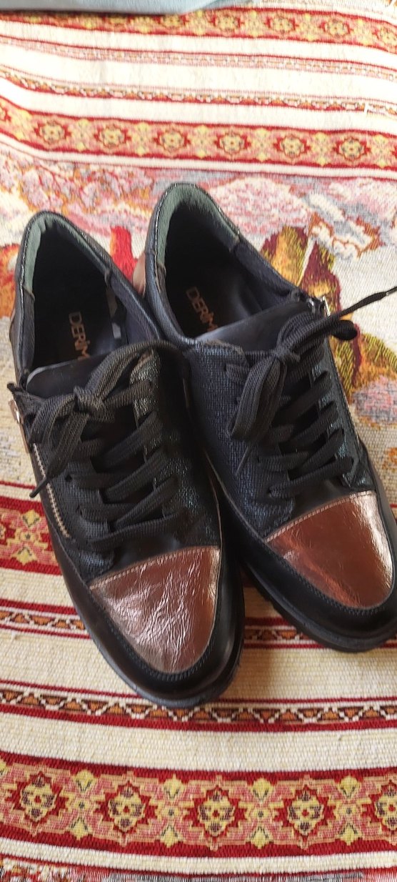 Derimod 38 numara siyah deri ayakkabı dolgu topuklu bağcıklı ve fermuarlı Sokak stiline uygun, günlük kullanıma idealdir. Bir kere giydim tertemiz yeni kutusu yok.