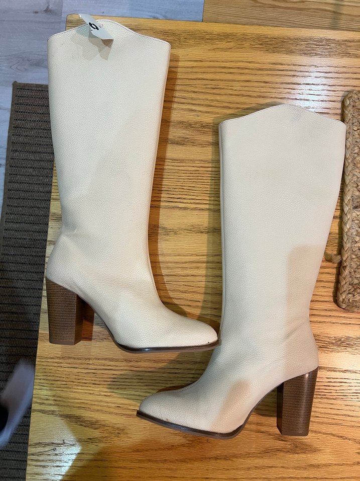 Bej renkli, deri dizüstü botlar, kalın topuklu ve tokalı detaylarla minimalist ve bohem tarzı yansıtıyor. Günlük kullanıma uygundur.