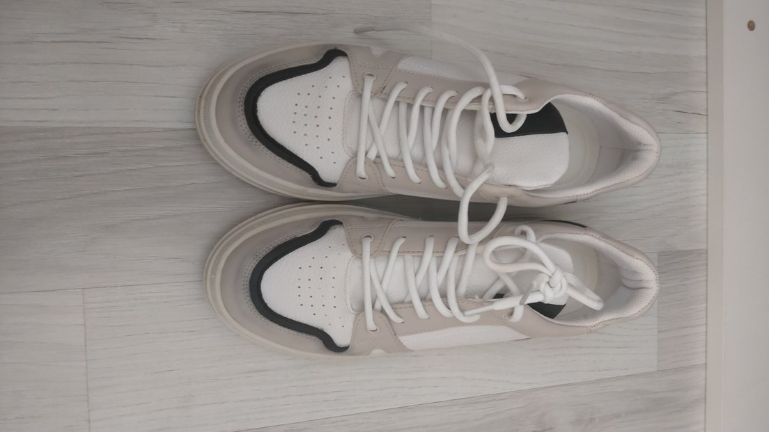 Beyaz, bağcıklı derimod spor ayakkabılar, kauçuk tabanlı ve gri detaylı, desen içermeyen sade bir tasarıma sahip. bir kez giyildi değişim tarihi kacirildigi ve büyük olduğu için satılıyor.