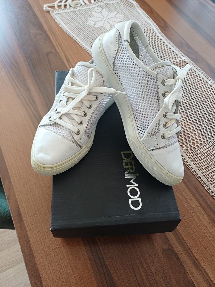 DERIMOD beyaz kadın spor ayakkabı fileli ve bağcıklıdır. Kauçuk malzemeden üretilmiş olup günlük sokak stili için uygundur. Hafif ve desensiz yapıya sahiptir. Az kullanıldı, görüldüğü gibi