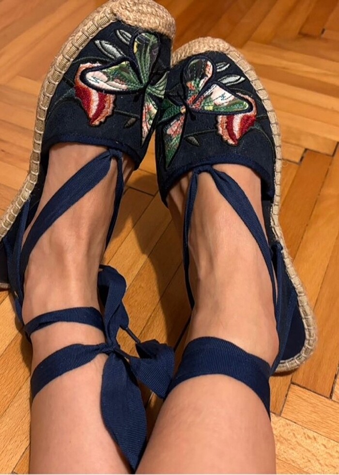 Toplam üç kere giydim, tabanı yumuşak, bilekten bağlı çok güzel bir espadril. Eteklerle ve jeanlerle çok iyi kombinleniyor. 39 numara ama kalıbı 38 gibi. Herhangi bir defosu yoktur. İhtiyaç fazlası olması nedeniyle satoyorum.