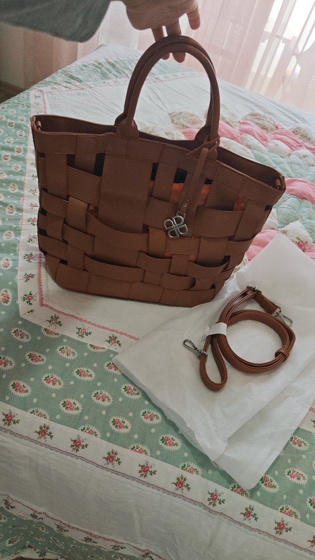 Kahverengi deri, tokalı kadın çanta, dokuma desende, bohem tarzda, günlük kullanıma uygun. Ayarlanabilir askı ile çok yönlü taşıma sağlar. hiç kullanılmadı.