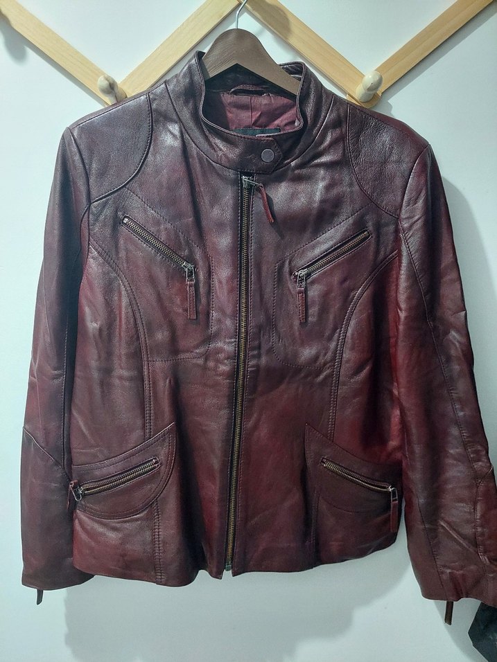 Bordo deri biker ceket, çıtçıtlı yaka ve fermuarlı ceplerle tasarlanmıştır. Normal boy ve regular fit, günlük kullanıma uygundur. aynısının siyahı da elimde mevcut