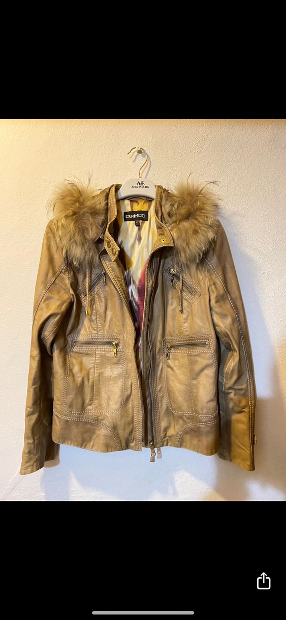 Vintage tarzı. %100 deridir. Kollarında çok hafif soyulmalar mevcuttur. Onun dışında mükemmel görünüyor.