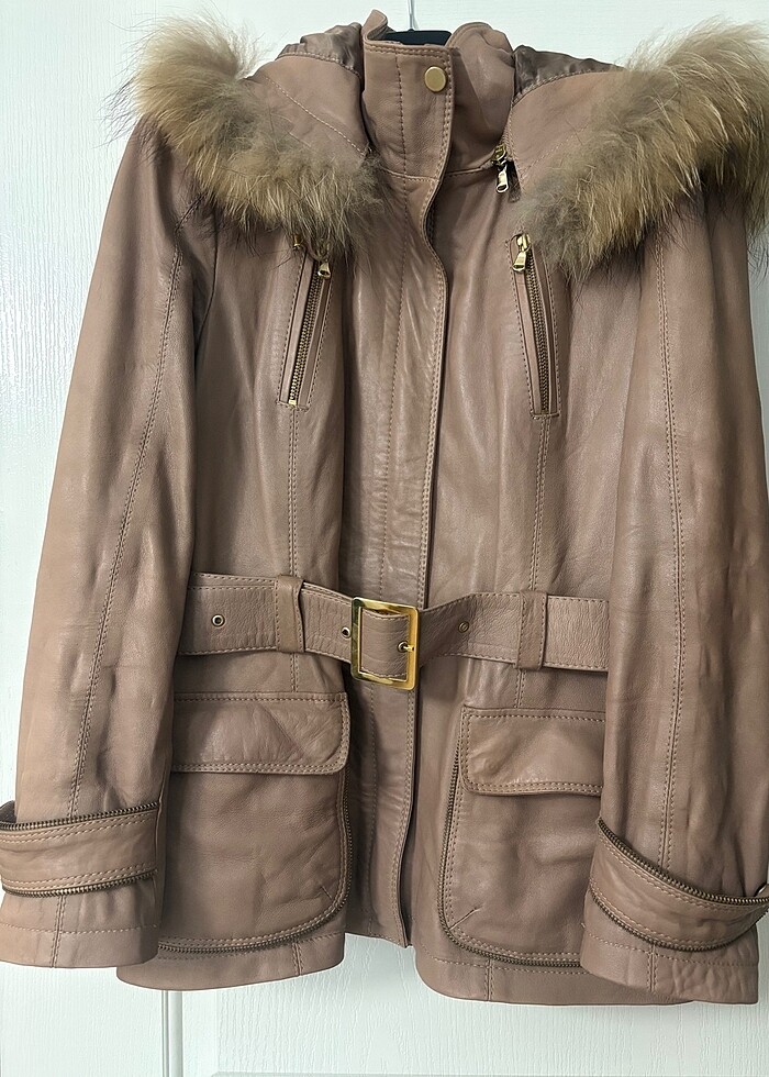 0deri, çok az kullanıldı, hiç hasarı yok. Rengi hafif pudraya çalan koyu bej gibi. Kuru temizleme yaptırıp kaldırdım, tertemiz. M beden ama s bedene daha uygun Şapkası istenirse çıkıyor
