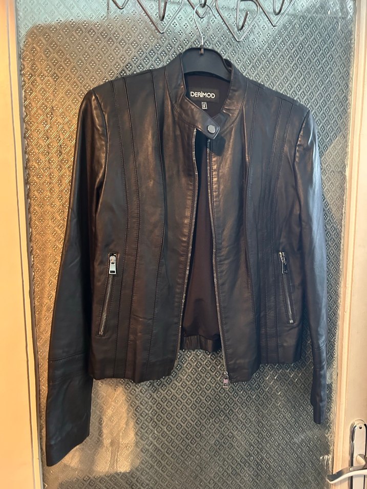 Derimod deri mont. S beden. Kol tarafında gösterdiğim gibi bikaç sürtünme gibi izler var, öndeki fermuar tarafında renk değişikliği olmuş küflenmiş gibi temizlenebilir bence, açılıp kapanmadında bi sorun yok. Yüzde yüz deri çok güzel bir mont #derimont #derimod #deri