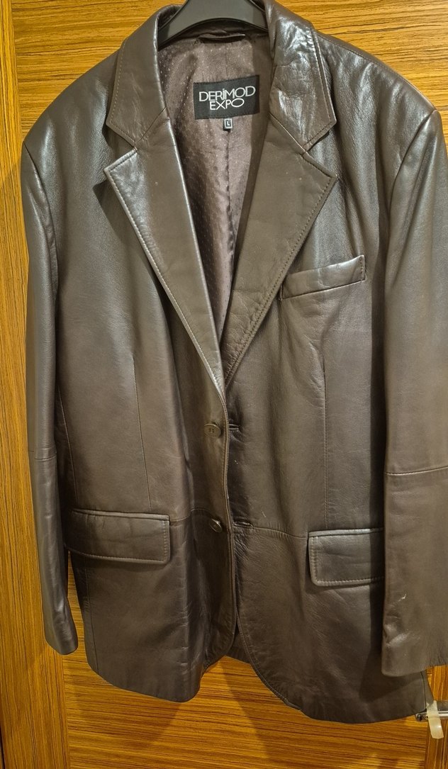 Kahverengi uzun deri erkek ceketi, klasik biker tarzında. Notlu yaka, uzun kollu,rahat kesim. DERMOD etiketi bulunur. Sayılı kullanıldı,uzun süredir dolapta duruyor,bu nedenle satıyorum.