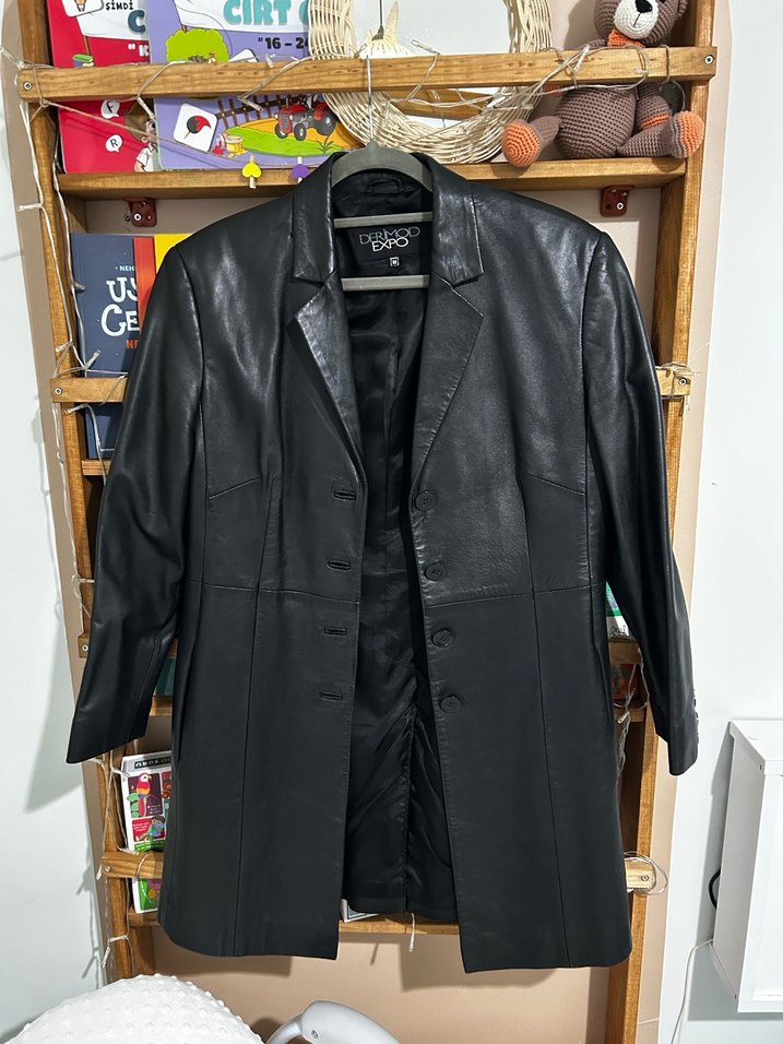 Notched yaka ve düğmeli kapamalı siyah deri kadın ceket. Uzun kollu, normal kesim ve midi boyda. Çok az kullanıldı boyun kısmında çok az yumuşama var ve gözümden kaçan noktalar varsa diye defoluyu işaretliyorum ihtiyaçtan dolayı satıyorum